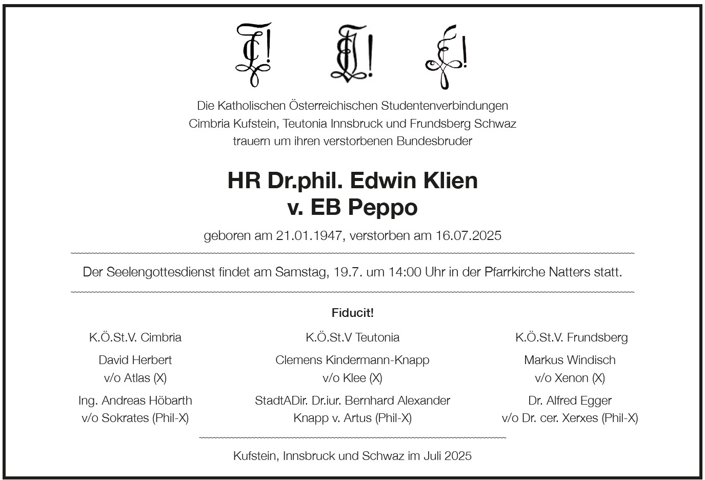 K.Ö.St.V. Cimbria Kufstein trauert um ihren Urphilister HR i.R. Dr. Edwin Klien v/o EB Peppo