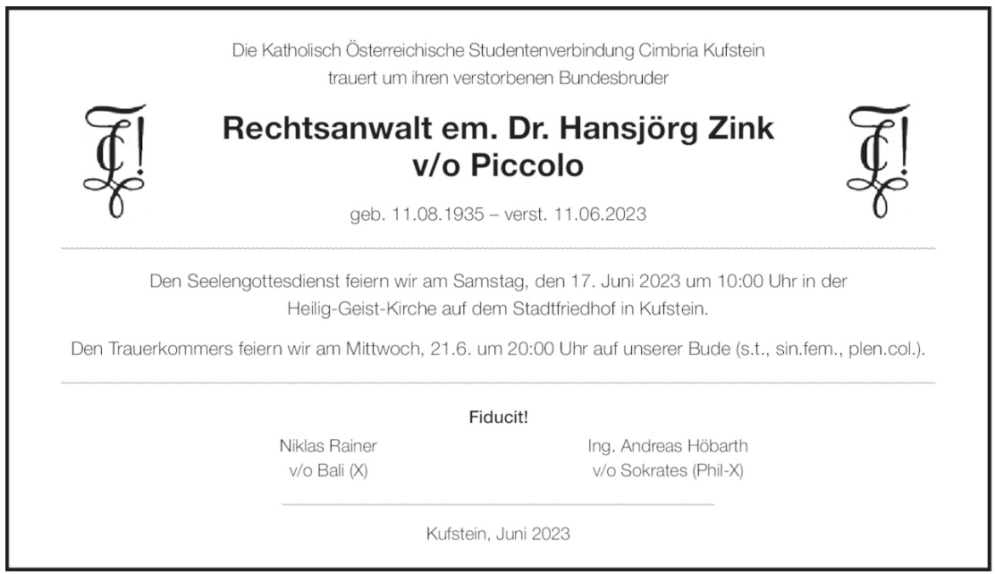 K.Ö.St.V. Cimbria Kufstein trauert um ihren Ehrenphilister Rechtsanwalt em. Dr. Hansjörg Zink v/o Piccolo