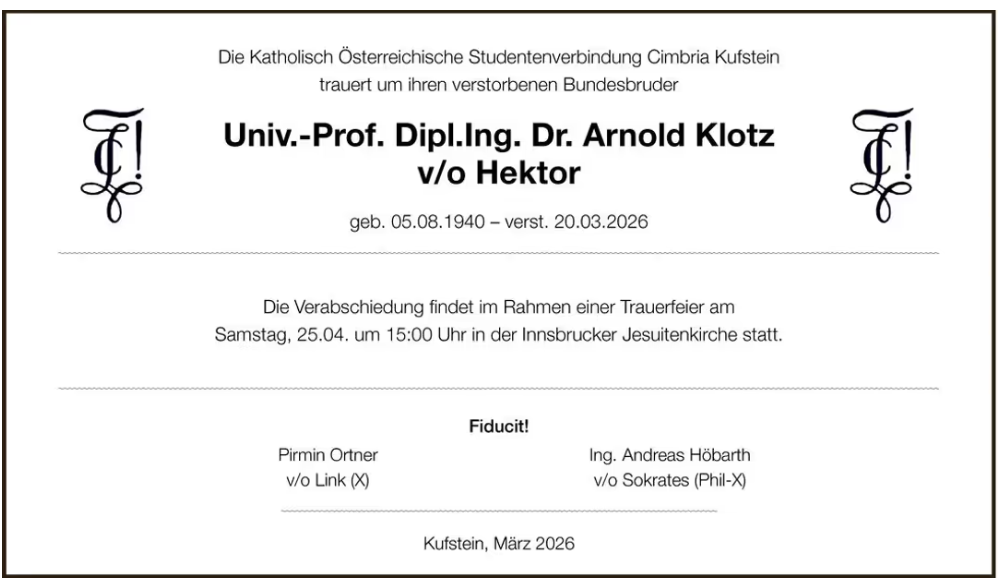 Trauerfeier für Bbr. Univ.-Prof. Dipl.Ing. Dr. Arnold KLOTZ v/o Hektor