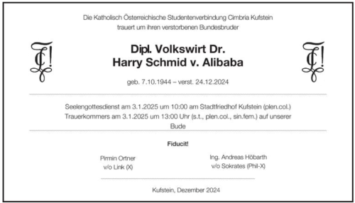 Den Trauerkommers für unseren Bundesbruder Alibaba feiern wir am Freitag, 3. Jänner 2025 um 13:00 Uhr auf unserer Bude im Bürgerturm (plen.col., sin.fem., s.t.).